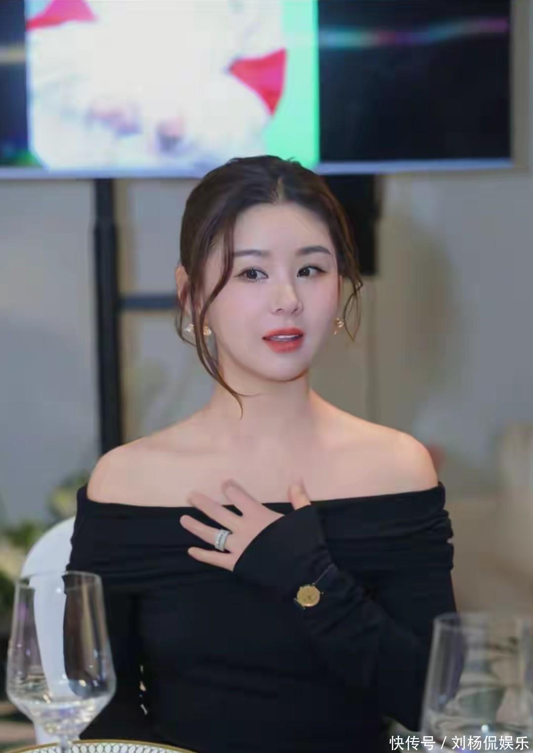 李小萌:身着黑色露肩长裙,妆容精致,皮肤白皙紧致,产后状态依旧出众,温柔的神态中满是为人母的幸福感。