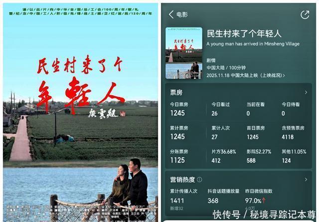 《百年程派》,戏曲类型,11月18日上映,排片占比仅有0.1%,全天票房8800块,加上之前的预售票房,累计票房23000块,制片方能分到8000块左右,先别说演员片酬,估计连剧组的矿泉水钱都不够。 《民生村来了个年轻人》,11月18日上映,排片占比是多少,相关网络平台并没有显示,全天票房1245块,累计票房也是1245块,该电影的总票房估计不会过1万,这点票房,不如进场打螺丝,大家觉得呢?