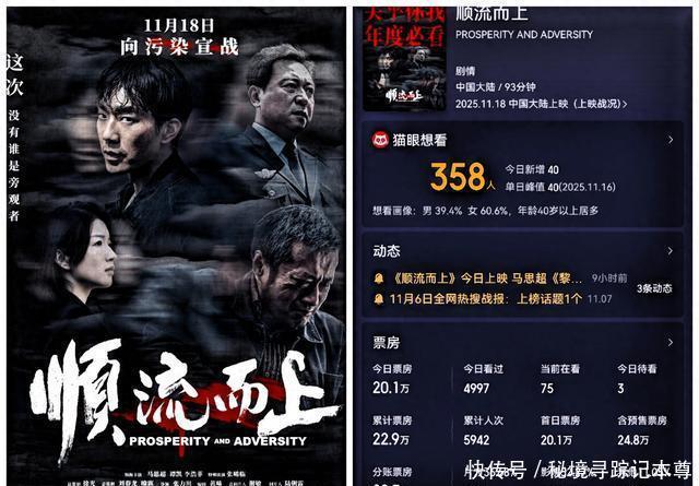 11月18日,星期二,真是一个好日子,共有5部新电影上映,分别是《顺流而上》《神秘家书》《百川东到海》《百年程派》《民生村来了年轻人》,票房一部比一部惨,最高20万,最低1000多块,令人唏嘘不已。 《顺流而上》,11月18日上映,排片占比2%,全天票房20万,加上之前的预售和点映票房,累计票房22万,至于最后能取得多少票房,谁也不敢预测,演员有马思超、谭凯、李浩菲等人,总体来说,品质还行。