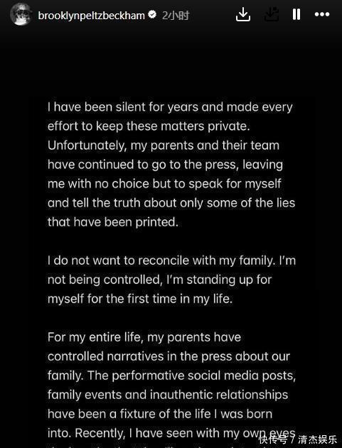 这事让布鲁克林觉得挺难堪的,于是在2025年8月,又为妮可拉搞了一场婚礼。不过,这回贝克汉姆家族完全没一个人来参加!那会儿,大家都觉得挺奇怪的,搞不懂布鲁克林为什么要避开爸妈,重新办一次婚礼。直到他发长文的时候,才算是揭开了这个谜底。